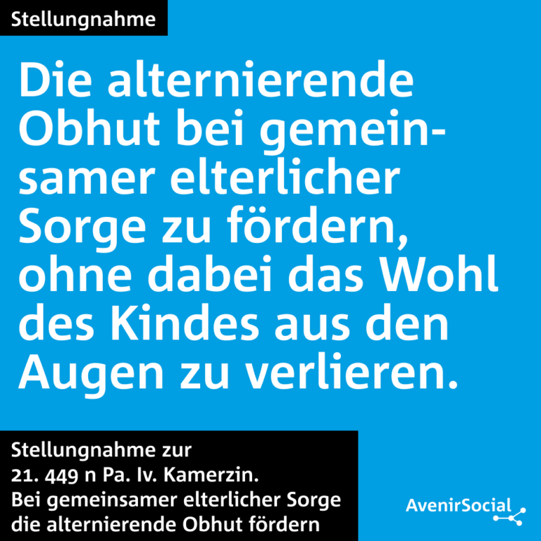 Berufsverband Soziale Arbeit Schweiz Mitglied werden AvenirShop Berufsverband Soziale Arbeit Schweiz 13.10.2025 Was wir tun Stellungnahme zur 21. 449 n Pa. Iv. Kamerzin. Bei gemeinsamer elterlicher Sorge die alternierende Obhut fördern AvenirSocial unterstützt die alternierende Obhut bei gemeinsamer elterlicher Sorge, sofern das Wohl des Kindes im Mittelpunkt steht. Eine gesetzliche Verpflichtung ... 30.09.2025 Mitglieder Jetzt anmelden In den Bildungsmodulen 2025 beleuchten wir zentrale Aspekte der Sozialen Arbeit. Anschaulich, praxisorientiert – und in diesem Jahr auch online! ... 29.09.2025 Publikationen SozialAktuell: Kinder – Akteur*innen der Gesellschaft Kinder gestalten die (zukünftige) Gesellschaft aktiv mit – ob in der Familie, im Schulalltag, in ihrer Nachbarschaft oder auf globaler ... 23.09.2025 Was wir tun Stellungnahme über die Volksinitiative «Für die Gleichstellung von Menschen mit Behinderungen (InklusionsInitiative)» und indirekter Gegenvorschlag AvenirSocial mit dem Gegenvorschlag zur Inklusions-Initiative zutiefst unzufrieden. In der vorgeschlagenen Form erfüllt er die zentralen Forderungen der Initiative nur ... Werbung 15.09.2025 Was wir tun Unsere Positionen zu den Geschäften der Herbstsession 2025 Ja zur Vorlage 25.019 «Änderung des SchKG (Sanierungsverfahren für natürliche Personen)» – Für ein wirksames Sanierungsverfahren mit dreijähriger Abschöpfungsphase Zusammen ... 11.09.2025 Was wir tun Stellungnahme zur Verordnungsanpassungen aufgrund der Übernahme des EU-Migrations- und Asylpakts Für AvenirSocial darf die Umsetzung des EU-Migrations- und Asylpakts nicht zu einer Verschlechterung der Rechte der betroffenen Personen führen. Wir ... 04.09.2025 Was wir tun BS/BL: Petition für gute Arbeitsbedingungen Die Arbeitsbedingungen in pädagogischen Heimen sind prekär. Viele verlassen den Bereich ausgebrannt und erschöpft. Das Resultat: noch mehr Druck auf ... 03.09.2025 Wer wir sind Région Vaud : la fin des subventions cantonales n’entame pas la détermination À compter du 1er janvier 2026, la Région Vaud d’AvenirSocial connaîtra une évolution structurelle. Le Secrétariat vaudois tel qu’il existe ... 26.08.2025 Was wir tun Sozialhilfegesetz Kanton Bern: Appell an den Berner Grossen Rat Eine Allianz von Organisationen der Zivilgesellschaft und Fachleuten aus der Praxis appellieren an die Mitglieder des Grossen Rates. Diese Revision ... 25.08.2025 Was wir tun Kanton Freiburg: Stellungnahme zur Schaffung eines Gesetzes zur Bekämpfung häuslicher Gewalt (FR) Die zunehmende Gewalt gegen Frauen und Mädchen offenbart anhaltende Geschlechterungleichheiten und den dringenden Bedarf nach einer starken politischen Antwort. AvenirSocial ... 19.08.2025 Wer wir sind Willkommen Olivier Schmid Wir freuen uns, Olivier Schmid als neuen Co-Redaktionsleiter bei AvenirSocial begrüssen zu dürfen. Olivier hat langjährige Erfahrung als Redaktor und ... 18.08.2025 Was wir tun Bern: Stellungnahme von AvenirSocial und SAGES zum Abbau der Sozialberatung am Inselspital Der Berufsverband Soziale Arbeit Schweiz (AvenirSocial) und der Schweizerische Fachverband für gesundheitsbezogene Soziale Arbeit (SAGES) zeigen sich tief besorgt über ... Werbung mehr