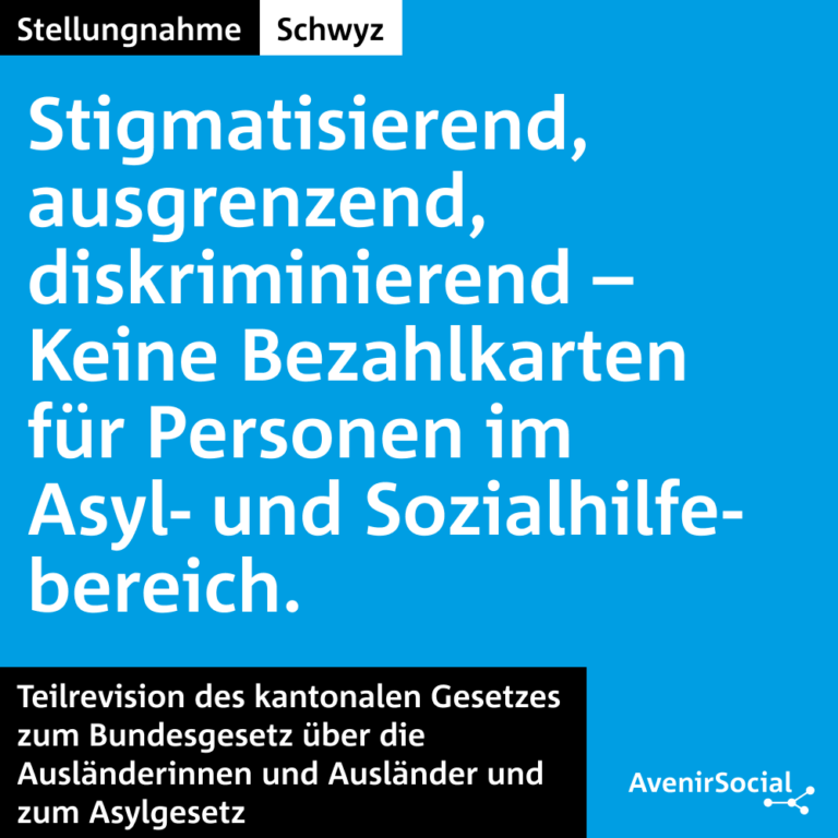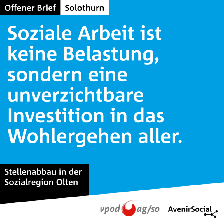 Berufsverband Soziale Arbeit Schweiz Mitglied werden AvenirShop Berufsverband Soziale Arbeit Schweiz 17.11.2025 Was wir tun Kanton Solothurn: Offener Brief zum Stellenabbau in der Region Olten In Olten droht ein Stellenabbau im Sozialbereich. Trotz der bereits heute angespannten personellen Situation hat der Oltner Stadtrat im Budget ... 12.11.2025 Was wir tun 2595 Unterschriften für gute Arbeitsbedingungen in Heimen Gemeinsame Medienmitteilung mit dem vpod Region Basel Die Arbeitsbedingungen in pädagogischen Heimen sind prekär. So kann es nicht weitergehen. Das ... 11.11.2025 Mitglieder Webinar: Partizipation in der Sozialen Arbeit Nach einer ersten Verbandsbroschüre zur Definition, professionsethischen und gesetzlichen Grundlagen der Partizipation hat AvenirSocial eine zweite Broschüre veröffentlicht. Sie widmet ... 11.11.2025 Publikationen SozialAktuell: Polizei Die Soziale Arbeit und die Polizei haben ein gemeinsames Ziel: verletzliche Personen zu schützen und zu unterstützen – eine gemeinsame ... Werbung 11.11.2025 Was wir tun Kanton Schwyz: Stellungnahme zur Teilrevision des kantonalen Gesetzes zum Bundesgesetz über die Ausländerinnen und Ausländer und zum Asylgesetz AvenirSocial lehnt die Einführung von Bezahlkarten für Personen im Asyl- und Sozialhilfebereich entschieden ab. Solche Karten untergraben die Selbstbestimmung und ... 27.10.2025 Was wir tun Stellungnahme zum Paket «Stabilisierung und Weiterentwicklung der Beziehungen Schweiz-EU» AvenirSocial begrüsst das Stabilisierungspaket Schweiz–EU grundsätzlich, sofern der Lohnschutz gesichert bleibt. Der Verband unterstützt die Verbesserungen bei Lohn- und Kündigungsschutz ... 23.10.2025 Was wir tun Rencontres du R.E.S.T.E – Travail social et enjeux écologiques : trois rendez-vous pour penser un monde écosocial (FR) Le Réseau Suisse Romand de Travail EcoSocial (RESTE) réunit praticien·ne·s, chercheur·euse·s et représentant·e·s d’institutions autour des liens entre travail social ... 23.10.2025 Was wir tun Kanton Waadt: Stellungnahme zur Schliessung der Werkstätten der Stiftung Le Relais (FR) L’Association professionnelle suisse du travail social exprime sa profonde préoccupation face à la fermeture des ateliers de la Fondation le ... 21.10.2025 Was wir tun Kanton Aargau: Medienmitteilung gegen die Initiative «Arbeit muss sich lohnen» Der Grosse Rat des Kantons Aargau hat heute leider mehrheitlich die Initiative «Arbeit muss sich lohnen» befürwortet und empfiehlt, sie ... 13.10.2025 Was wir tun Stellungnahme zur 21. 449 n Pa. Iv. Kamerzin. Bei gemeinsamer elterlicher Sorge die alternierende Obhut fördern AvenirSocial unterstützt die alternierende Obhut bei gemeinsamer elterlicher Sorge, sofern das Wohl des Kindes im Mittelpunkt steht. Eine gesetzliche Verpflichtung ... 30.09.2025 Mitglieder Jetzt anmelden In den Bildungsmodulen 2025 beleuchten wir zentrale Aspekte der Sozialen Arbeit. Anschaulich, praxisorientiert – und in diesem Jahr auch online! ... 29.09.2025 Publikationen SozialAktuell: Kinder – Akteur*innen der Gesellschaft Kinder gestalten die (zukünftige) Gesellschaft aktiv mit – ob in der Familie, im Schulalltag, in ihrer Nachbarschaft oder auf globaler ... Werbung mehr
