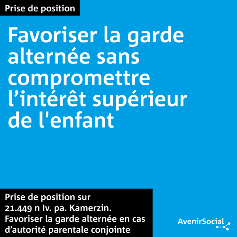 Association professionnelle suisse du travail social Devenir membre AvenirShop Association professionnelle suisse du travail social 13.10.2025 Que faisons-nous Prise de position sur 21.449 n Iv. pa. Kamerzin. Favoriser la garde alternée en cas d’autorité parentale conjointe AvenirSocial soutient la garde alternée en cas d’autorité parentale conjointe – à condition que l’intérêt supérieur de l’enfant reste au ... 30.09.2025 Membres Inscrivez-vous maintenant Les modules de formation 2025 abordent des aspects essentiels du travail social. Ils sont clairs, pratiques et, cette année, aussi disponibles ... 29.09.2025 Publications ActualitéSocial: Enfants citoyen·ne·s Les enfants contribuent activement à façonner la société (de demain), que ce soit au sein de leur famille, à l'école, ... 23.09.2025 Que faisons-nous Prise de position sur l’initiative populaire fédérale « Pour l’égalité des personnes handicapées (initiative pour l’inclusion) » et contre-projet indirect AvenirSocial exprime une profonde insatisfaction pour le contre-projet à l’initiative pour l’inclusion. Tel que proposé, il répond de manière insuffisante ... 15.09.2025 Que faisons-nous Nos Positions sur les objets de la session d’automne 2025 Oui au projet 25.019 « Modification de la loi fédérale sur la poursuite pour dettes et la faillite (procédure d'assainissement ... 11.09.2025 Que faisons-nous Prise de position sur les modifications d’ordonnances en raison de la reprise du pacte de l’UE sur la migration et l’asile (DE) Pour AvenirSocial, la mise en œuvre du pacte européen sur la migration et l’asile ne doit pas se traduire par ... 04.09.2025 Que faisons-nous BS/BL: Petition für gute Arbeitsbedingungen (DE) Die Arbeitsbedingungen in pädagogischen Heimen sind prekär. Viele verlassen den Bereich ausgebrannt und erschöpft. Das Resultat: noch mehr Druck auf ... 03.09.2025 Qui sommes-nous Région Vaud : la fin des subventions cantonales n’entame pas la détermination À compter du 1er janvier 2026, la Région Vaud d’AvenirSocial connaîtra une évolution structurelle. Le Secrétariat vaudois tel qu’il existe ... 26.08.2025 Que faisons-nous Loi sur l’aide sociale du Canton de Berne : appel aux membres du Grand Conseil Une alliance d'organisations de la société civile et des professionnel·le·s de terrain lancent un appel aux membres du Grand Conseil. ... 25.08.2025 Que faisons-nous Canton de Fribourg : Prise de position sur la création d’une loi visant à lutter contre la violence domestique Les violences faites aux femmes et aux filles augmentent, révélant des inégalités de genre persistantes et un besoin urgent d’une ... 19.08.2025 Qui sommes-nous Bienvenue Olivier Schmid Nous sommes heureux d'accueillir Olivier Schmid en tant que nouveau co-rédacteur en chef chez AvenirSocial. Olivier possède une longue expérience ... 18.08.2025 Que faisons-nous Berne : Prise de position d’AvenirSocial et de SAGES sur le démantèlement du service social de l’Hôpital de l’Ile L'Association professionnelle suisse du travail social (AvenirSocial) et l'Association suisse pour le travail social en lien avec la santé (SAGES) ... plus